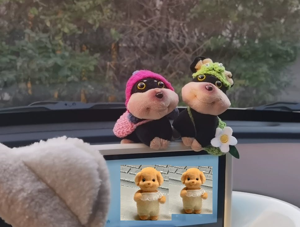 Knitted rabbit ears + a silly Bee-Dog face, with vibrant, unique colors. It stands out on your center screen/dashboard—even your friends will ask where you got it!
