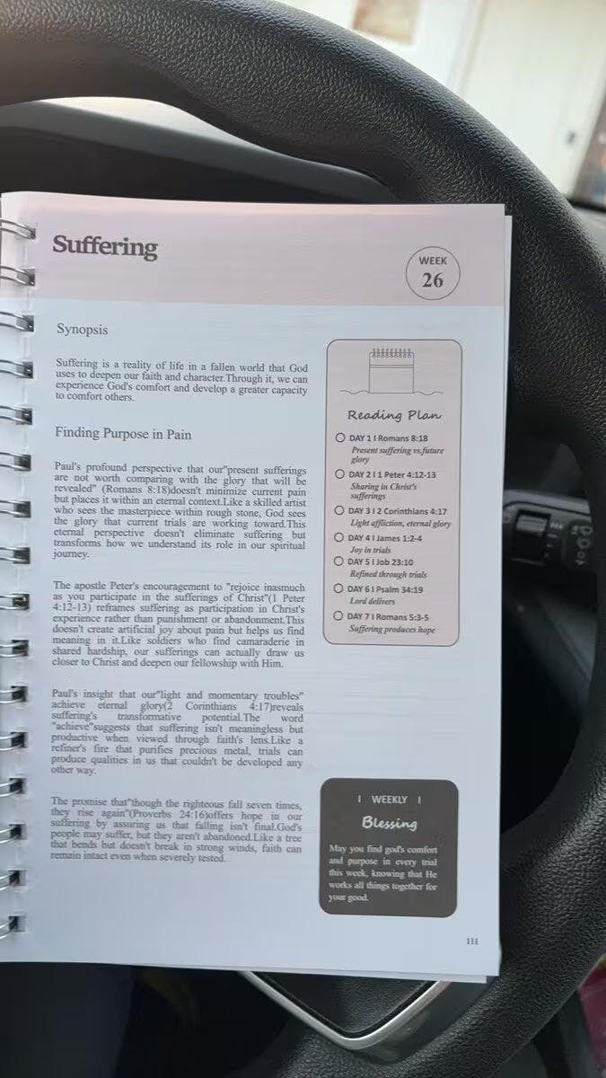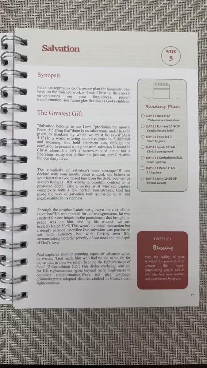 Each week includes a key theme, 7 selected Bible passages, an inspirational devotional, 3 reflection questions, and a closingblessing -designed to help you grow in faith without feeling overwhelmed.