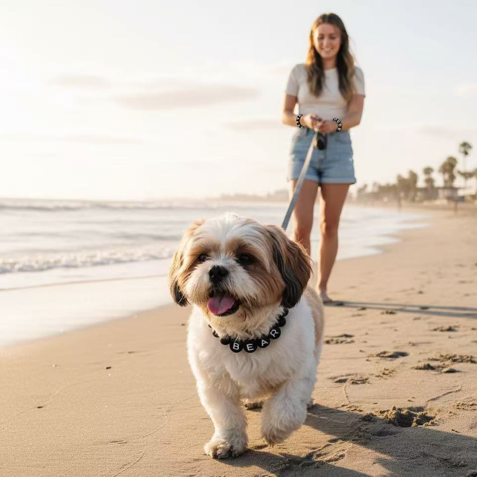 Our collars are made to order in your chosen size and are not adjustable. We do this to ensure the beadedsection is centered and your dog's name sits perfectly in place. To get the best fit, just follow our quick sizingguide before ordering!