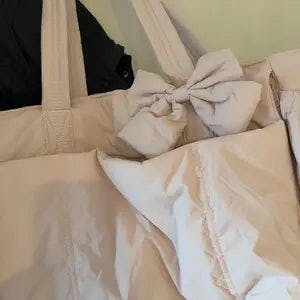 This little tote is sooo cute with the bow and it has the capacity to hold all my teacher gear without being overloaded. Nice puffy nylon will be easy to spot clean and the straps are puffy as well! Love it!