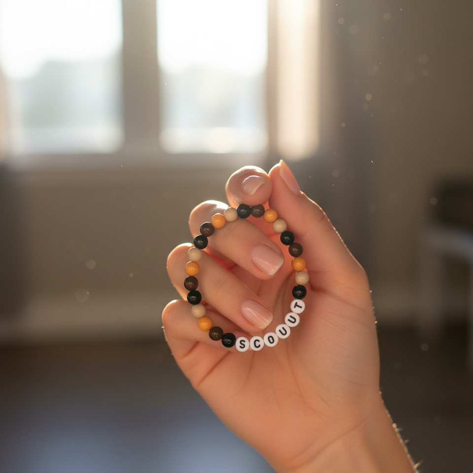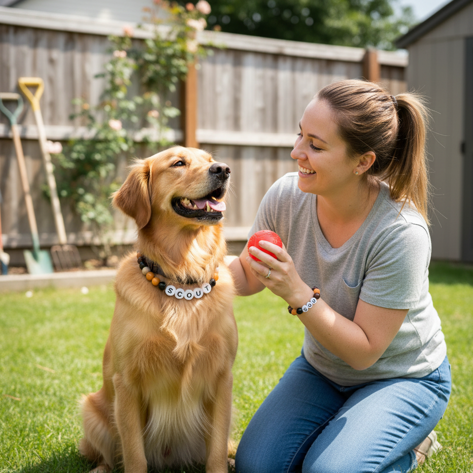 Materials: Biothane strap, metal D-ringstainless steel cable, 20mm acrylic beads;Big PLA+ letter beads